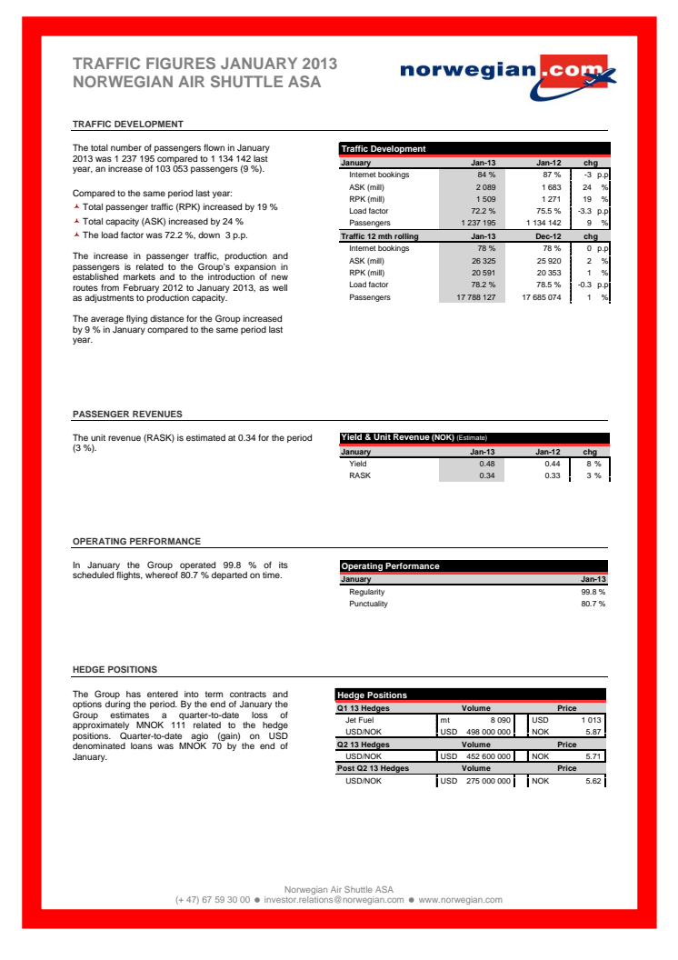 Norwegian flög mer än 1,2 miljoner passagerare under januari månad, en ökning med 9 procent jämfört med samma månad föregående år.