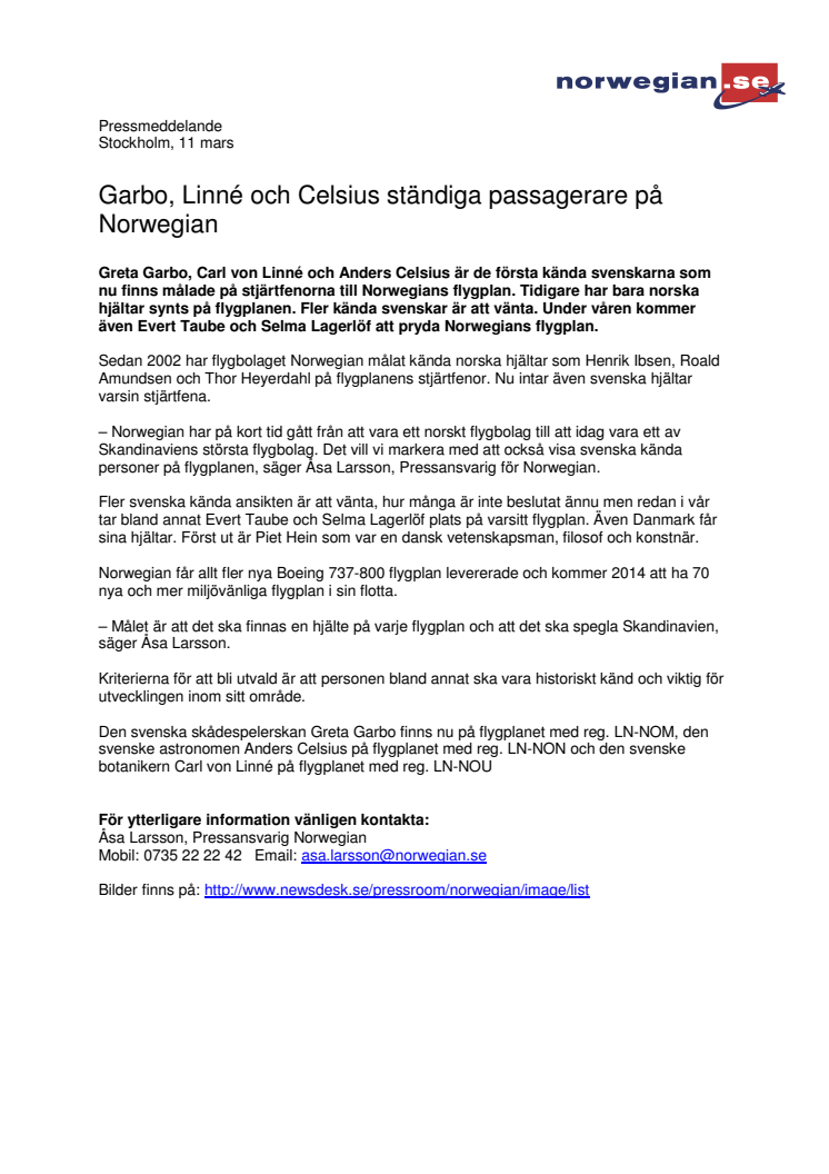 Greta Garbo, Carl von Linné och Anders Celsius är de första kända svenskarna som nu finns målade på stjärtfenorna till Norwegians flygplan. Tidigare har bara norska hjältar synts på flygplanen. Fler kända svenskar är att vänta. Under våren kommer även Evert Taube och Selma Lagerlöf att pryda Norwegians flygplan.