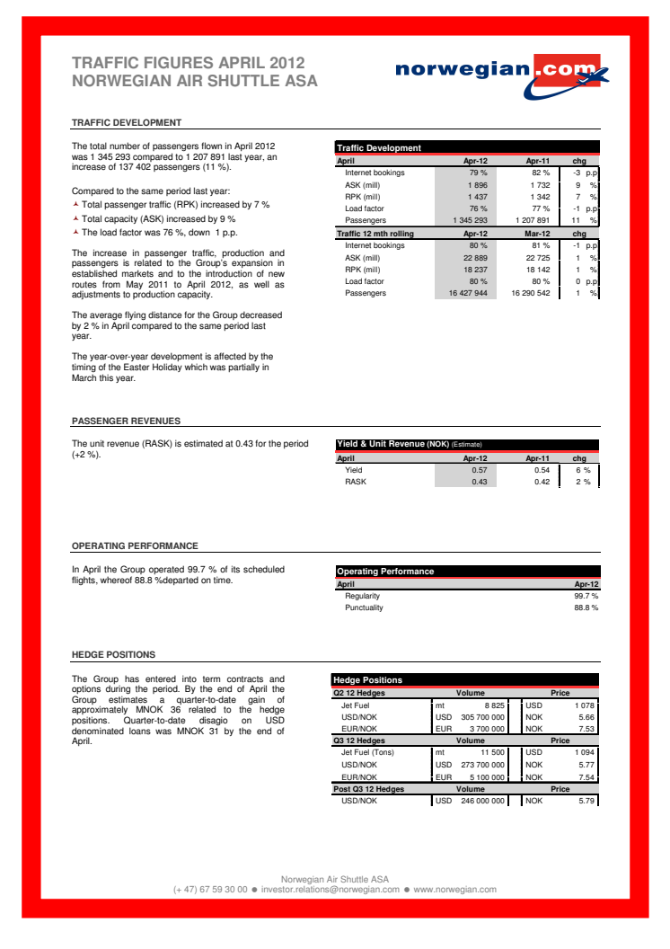 Den goda passagerartillväxten för Norwegian fortsatte i april. Över 1,3 miljoner passagerare flög med bolaget, vilket är 137 400 (11 procent) fler passagerare än i april föregående år. Norwegians trafiksiffror för april är påverkade av påsken, där den största resehelgen inföll redan sista helgen i mars.