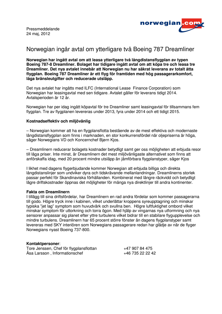 Norwegian har ingått avtal om att leasa ytterligare två långdistansflygplan av typen Boeing 787-8 Dreamliner. Bolaget har tidigare ingått avtal om att köpa tre och leasa tre Dreamliner. Det nya avtalet innebär att Norwegian nu har säkrat leverans av totalt åtta flygplan. Boeing 787 Dreamliner är ett flyg för framtiden med hög passagerarkomfort, låga bränsleutgifter och reducerade utsläpp.
