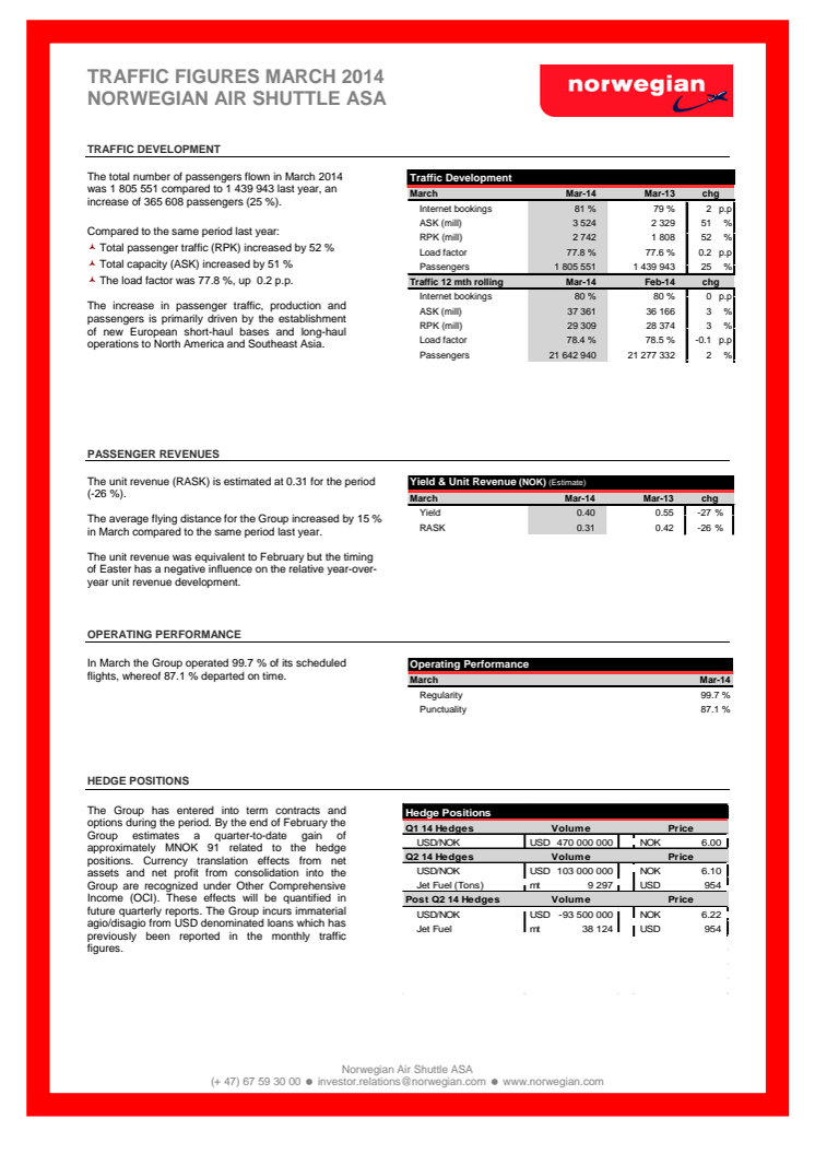 Norwegian flög drygt 1,8 miljoner passagerare i mars 2014, en ökning med 25 procent jämfört med samma månad förra året. Kapacitetstillväxten var på höga 51 procent, i absoluta tal den största kapacitetstillväxten som Norwegian någonsin har haft under en månad.