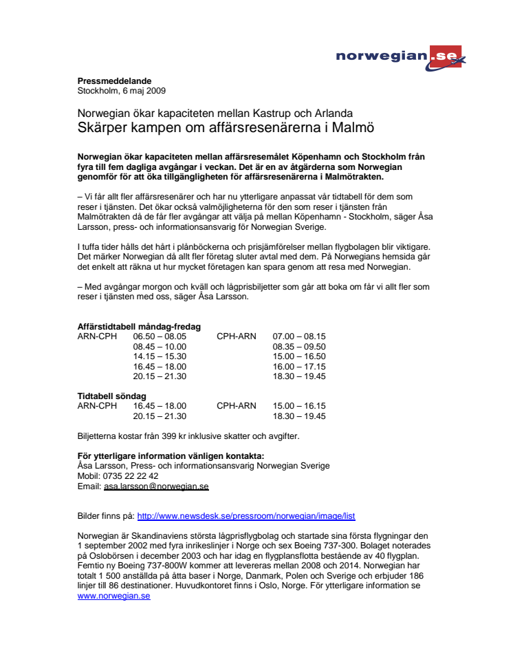 Norwegian ökar kapaciteten mellan affärsresemålet Köpenhamn och Stockholm från fyra till fem dagliga avgångar i veckan. Det är en av åtgärderna som Norwegian genomför för att öka tillgängligheten för affärsresenärerna i Malmötrakten.