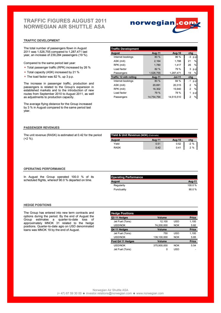 Den goda passagerartillväxten för Norwegian fortsatte även under augusti. Mer än 1,5 miljoner passagerare flög med bolaget, vilket är en ökning på 19 procent jämfört med samma period föregående år. Samtidigt låg kabinfaktorn på 82 procent.