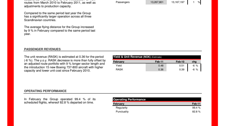 I februari flög 935 488 passagerare med Norwegian, jämfört med 834 884 passagerare föregående år. Det är 100 604 (12 procent) fler passagerare jämfört med februari 2010. Kabinfaktorn var på 76 procent, samma som föregående år, trots en kapacitetsökning på 26 procent.