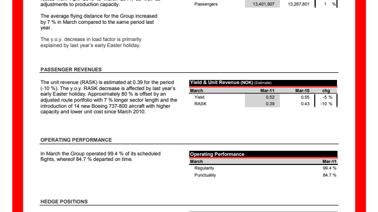 Bolaget utförde 99,4 procent av sina planlagda flygningar under mars månad, varav 84,7 procent avgick på utsatt tid.