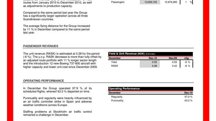 Bolaget utförde 97,9 procent av sina planlagda flygningar under december månad, varav 63,2 procent avgick på utsatt tid. Punktligheten under december påverkades starkt av flygledarstrejken i Spanien samt dåliga väderförhållanden och stängda flygplatser i flera städer runt om i Europa. Norwegian blev speciellt påverkade av problemen på London Gatwick, dit bolaget har ett stort antal flygningar från flera städer i Skandinavien.