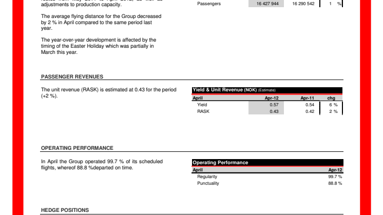 Kabinfaktorn var på 76 procent, en procentenhet lägre jämfört med samma månad föregående år. Yielden för april var 6 procent bättre än samma månad föregående år.
