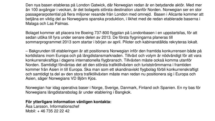 Under våren 2013 etablerar Norwegian ytterligare en europeisk bas, den här gången i London. Bolaget kommer även att etablera en bas i Alicante, Spanien. Från basen i London kommer Norwegian att erbjuda en rad direktlinjer till populära destinationer runt Medelhavet samt i Norden. Med den nya basen i England kommer bolaget att vara väl positionerade för att möta konkurrensen från asiatiska och europeiska flygbolag i långdistansmarknaden.