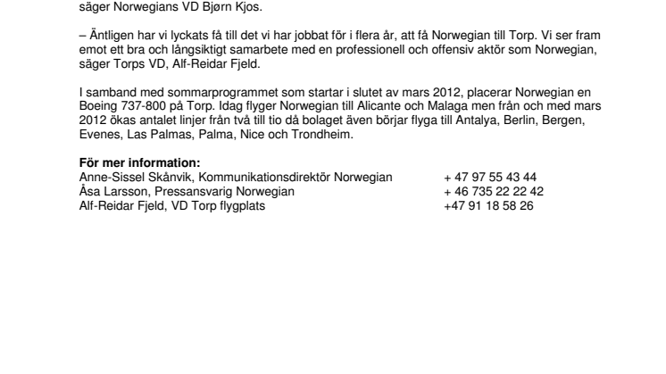 – Äntligen har vi lyckats få till det vi har jobbat för i flera år, att få Norwegian till Torp. Vi ser fram emot ett bra och långsiktigt samarbete med en professionell och offensiv aktör som Norwegian, säger Torps VD, Alf-Reidar Fjeld.