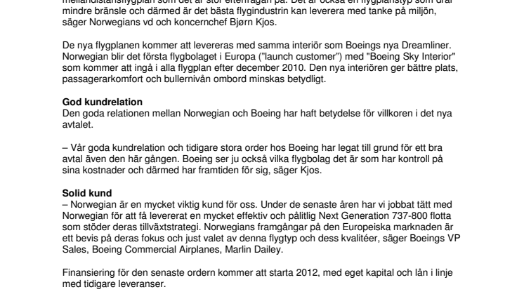– Norwegian är en mycket viktig kund för oss. Under de senaste åren har vi jobbat tätt med Norwegian för att få levererat en mycket effektiv och pålitlig Next Generation 737-800 flotta som stöder deras tillväxtstrategi. Norwegians framgångar på den Europeiska marknaden är ett bevis på deras fokus och just valet av denna flygtyp och dess kvalitéer, säger Boeings VP Sales, Boeing Commercial Airplanes, Marlin Dailey.