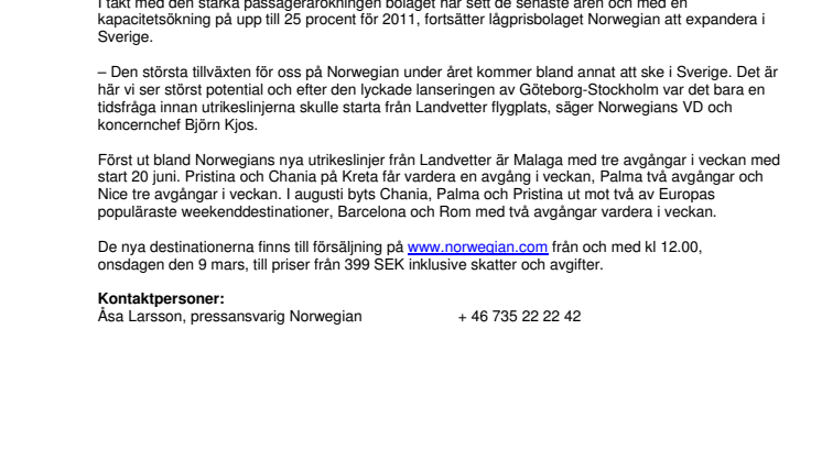 I takt med den starka passagerarökningen bolaget har sett de senaste åren och med en kapacitetsökning på upp till 25 procent för 2011, fortsätter lågprisbolaget Norwegian att expandera i Sverige.