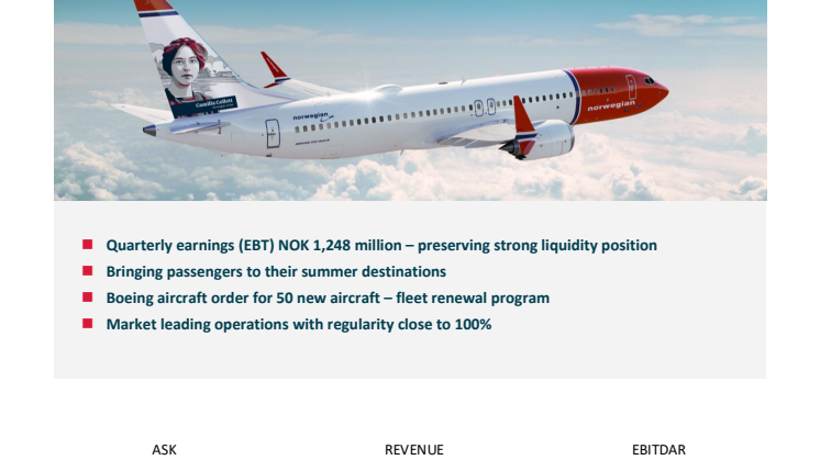 Resultat före skatt (EBT) för andra kvartalet uppgick till 1 248 MNOK, påverkat av både återinförande av förskottsbetalning i samband med köp av flygplan och höga bränslekostnader under kvartalet. Kassaflöde och likvida medel på 7,5 miljarder NOK är oförändrat från förra kvartalet. Vid slutet av kvartalet hade bolaget en flotta på 65 flygplan.