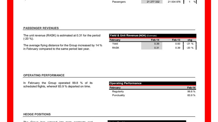 I februari flög 1 527 099 passagerare med Norwegian, en ökning med 22 procent jämfört med samma månad förra året. Den totala trafiktillväxten (RPK) ökade med 48 procent i februari