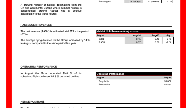 I augusti flög 2 344 253 passagerare med Norwegian, en ökning med 19 procent jämfört med samma månad föregående år. Den totala trafiktillväxten (RPK) ökade med 44 procent medan kapaciteten (ASK) ökade med 37 procent under augusti. Kabinfaktorn var på 83,6 procent, upp 4,4 procentenheter.