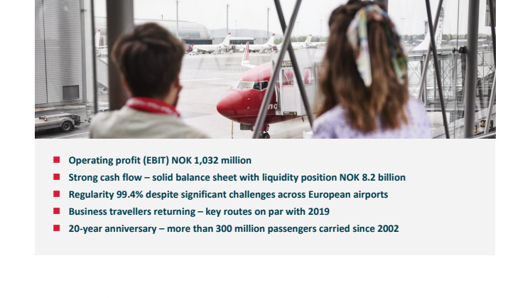 Många kunder har längtat efter att resa till Norwegians sommardestinationer. Det har resulterat i en kraftigt uppdämd efterfrågan på fritidsresor under sommarens högsäsong och under hela tredje kvartalet. Kabinfaktorn var på närmare 95 procent i juli, den högsta på många år medan enhetsintäkterna under kvartalet nådde en historiskt hög nivå. Norwegian hade över 6 miljoner passagerare under tredje kvartalet och nästan alla schemalagda flygningar genomfördes enligt plan, trots rekordhöga förseningar och utmaningar på flygplatser runt om i Europa.