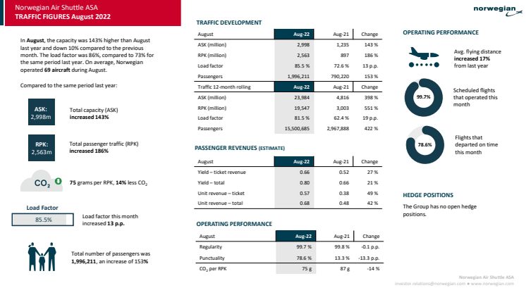 I augusti hade Norwegian 1 996 211 passagerare, mot 790 220 i augusti 2021. Kabinfaktorn var på 85,5 procent. Kapaciteten (ASK) var 2 998 miljoner passagerarkilometer, medan faktisk passagerartrafik (RPK) var 2 563 miljoner. I augusti hade Norwegian i genomsnitt 69 flygplan i drift och 99,7 procent av alla planerade flygningar genomfördes. Punktligheten, som mäter antal avgångar som går inom 15 minuter efter ordinarie tidtabell, var 79 procent i augusti. Samtidigt landade 96,5 procent av alla flygningar enligt tidtabell eller uppemot en timme senare.