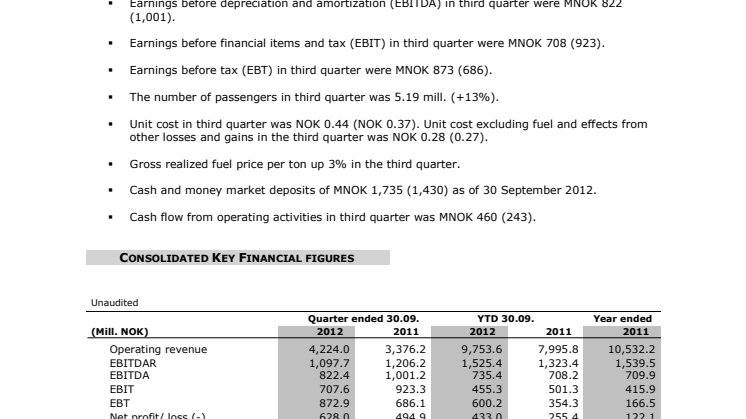 Under tredje kvartalet, flög Norwegian närmare 5,2 miljoner passagerare. Det är 580 000 fler än föregående år och även det ett nytt rekord för bolaget. Kvartalet är också präglat av en hög kabinfaktorn på 82 procent. Varje passagerare flög i snitt längre vilket reflekteras i att passagerartrafiken (RPK) ökade med 17 procent under tredje kvartalet, säteskapaciteten (ASK) ökade med 20 procent.