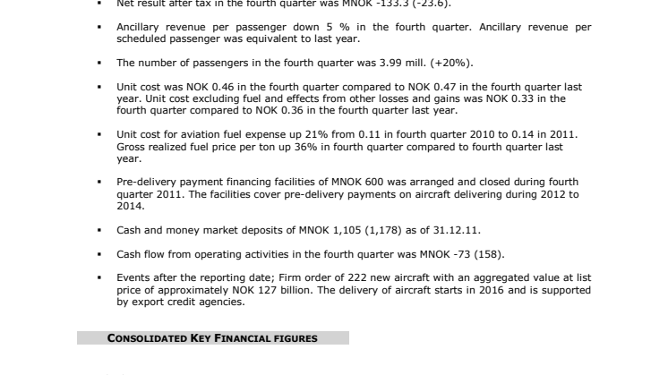 – Den underliggande driften under 2011 är mycket god, trots att ett säsongsmässigt svagt kvartal speciellt, har påverkats av stark konkurrens på marknaden, högre bränsleutgifter och kostnader knutna till återleverering av äldre flygplan. Årsresultatet och siffrorna för fjärde kvartal visare på en kraftig tillväxt både i antal passagerare, kapacitet samt fyllningsgrad. Resultatmarginalerna är förbättrade och vi har fått en positiv effekt på intjäningen tack vare nya, större och mer kostnadseffektiva flygplan. För fjärde kvartalet enskilt, ser vi en plattare tendens, men den överordnade bilden är att utskiftningen av flygplansflottan har gett oss en betydlig konkurrensfördel i en marknad där många flygbolag är starkt pressade på grund av gamla flygplan och höga bränslekostnader. Inte minst, ger nya flygplan våra kunder ett stadigt bättre erbjudande, något som avspeglar sig i det goda passagerarantalet, säger Norwegians VD och koncernchef Bjørn Kjos.