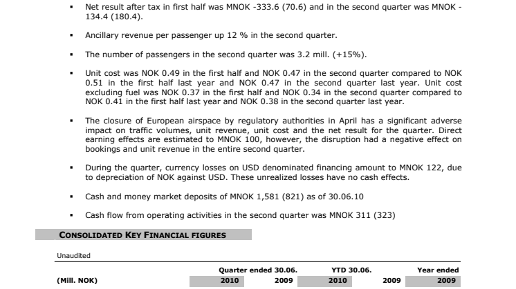 3,2 miljoner passagerare valde att flyga med Norwegian under andra kvartalet 2010, det är 15 procent mer jämfört med samma period föregående år. Omsättningen uppgick till 2 miljarder norska kronor, en ökning på 7 procent. Nettoresultatet efter skatt hamnade på – 134 miljoner norska kronor. Resultatet är starkt påverkat av myndigheternas stängning av luftrummet under våren. Norwegian fortsätter att hålla en stadig kurs mot fler flygplan och lägre kostnader.