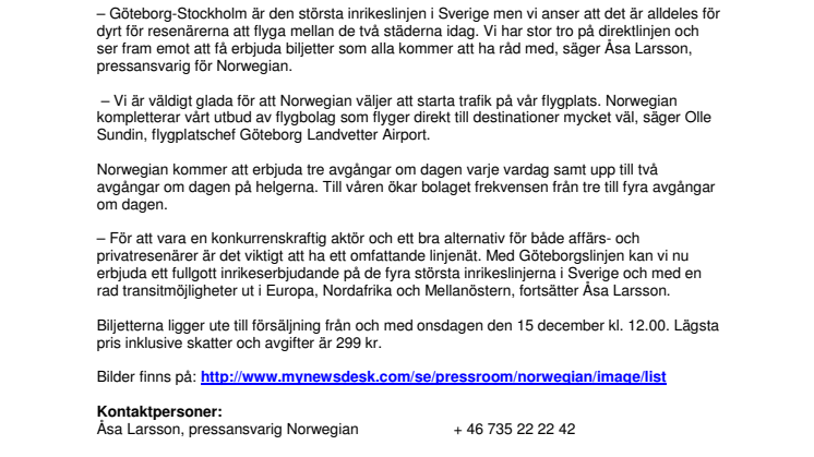– Göteborg-Stockholm är den största inrikeslinjen i Sverige men vi anser att det är alldeles för dyrt för resenärerna att flyga mellan de två städerna idag. Vi har stor tro på direktlinjen och ser fram emot att få erbjuda biljetter som alla kommer att ha råd med, säger Åsa Larsson, pressansvarig för Norwegian.