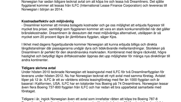 Under hösten 2010 tecknade Norwegian ett leasingavtal med ILFC för två Dreamlinerflygplan för leverans under hösten 2012. Nu har Norwegian tecknat ett nytt avtal med samma företag. Avtalet löper på 12 år. ILFC är ett av världens största leasingföretag med fler än 1000 flygplan och är baserat i Kalifornien, USA. ILFC har en totalorder hos Boeing på 74 Dreamliners. Norwegian leasar även flera Boeing 737-800 flygplan från ILFC och har redan ett bra upparbetat samarbete med företaget.