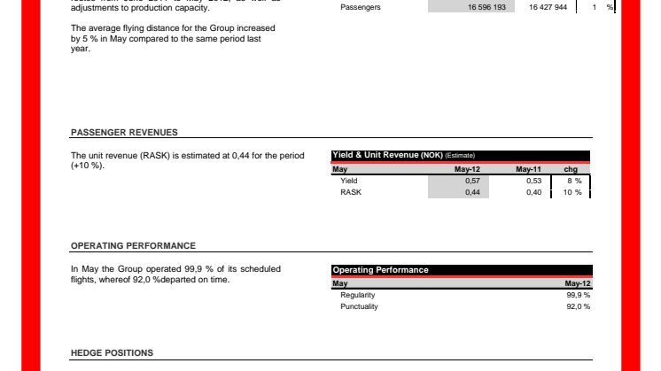 I maj flög 1 542 723 passagerare med Norwegian, en ökning på 12 procent jämfört med samma månad föregående år. Norwegians kapacitetsväxt (ASK) uppgick till 14 procent. Kabinfaktorn var på 77 procent, 1 procentenhet högre än i maj föregående år. Enhetsintäkterna (RASK) ökade med 10 procent.