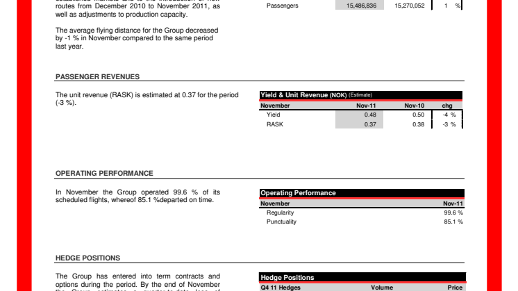 I november flög 1 301 566 passagerare med Norwegian. Den totala passagerartrafiken (RPK) ökade med 19 procent. Kabinfaktorn under november var 77 procent, samma som november föregående år då kabinfaktorn ökade betydligt jämfört med november 2009.
